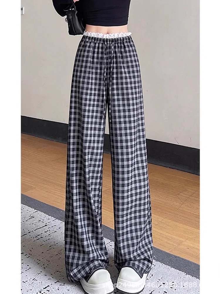 韓国風 レース チェック柄 ワイドパンツ レディース 春夏新作 ハイウエスト 合わせやすい ゆったりとしたお出かけ用パンツ ストレートシルエットのカジュアルパンツ