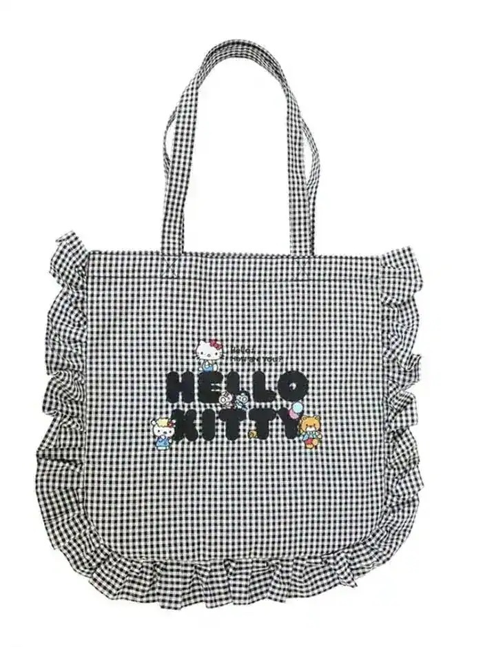 マイエコバッグ探し 韓国 バッグ トートバッグ キャンバス 通学 通勤 大容量トートバッグ エコバッグ サンリオモノクロチェックフリルショルダーバッグ手提げ袋帆布袋通勤通勤