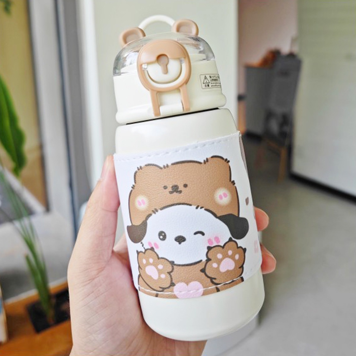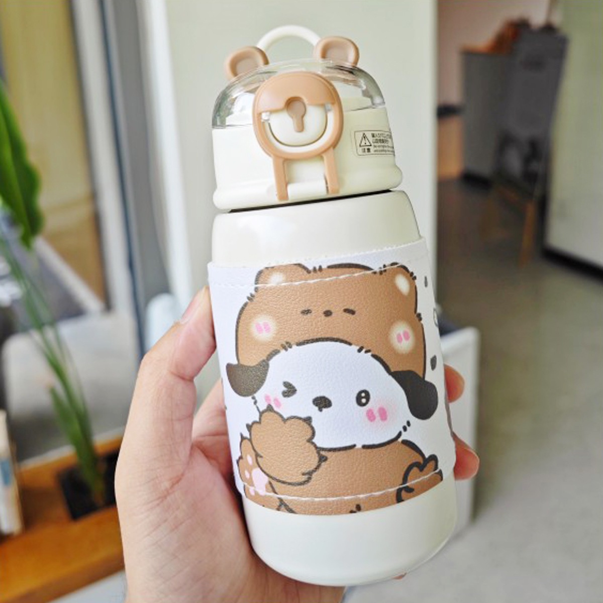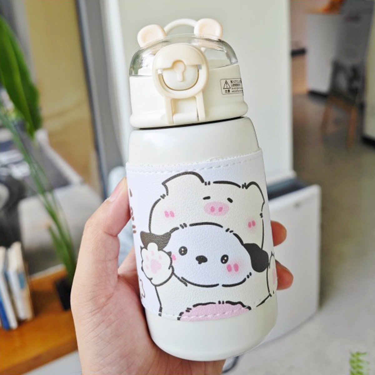 【2026年新作】カートゥーン レザーカバー付き保温ボトル 学生可愛いストローカップ 携帯便利 萌え系ロリータ女性ステンレス水筒