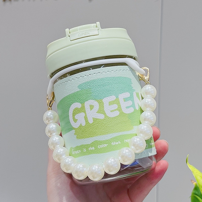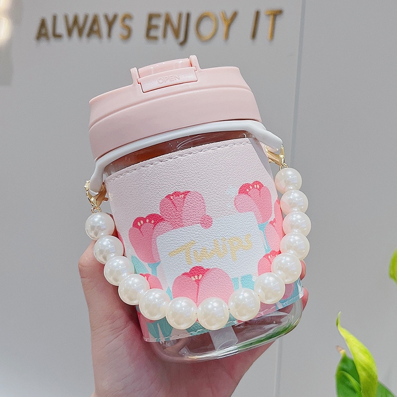 【2026年新作】パールチェーン付き ガラスボトル ストロー付き二役飲み口 ハンドル付き 少女爽やか可愛い高見えタンブラー
