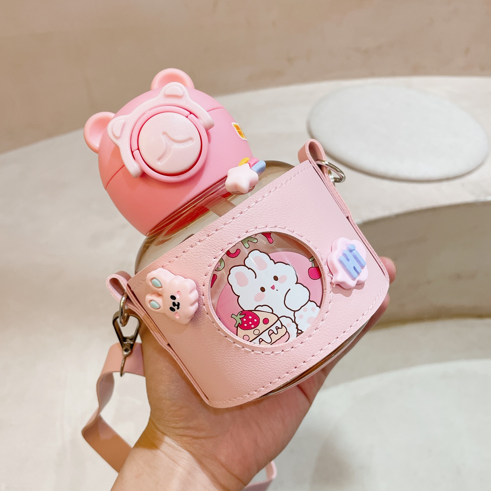 【2026年新作】ぽっちゃり 子供水筒 レザーカバー付き 高見えストローカップ 携帯便利耐衝撃 ポップ蓋斜め掛け可愛いタンブラー