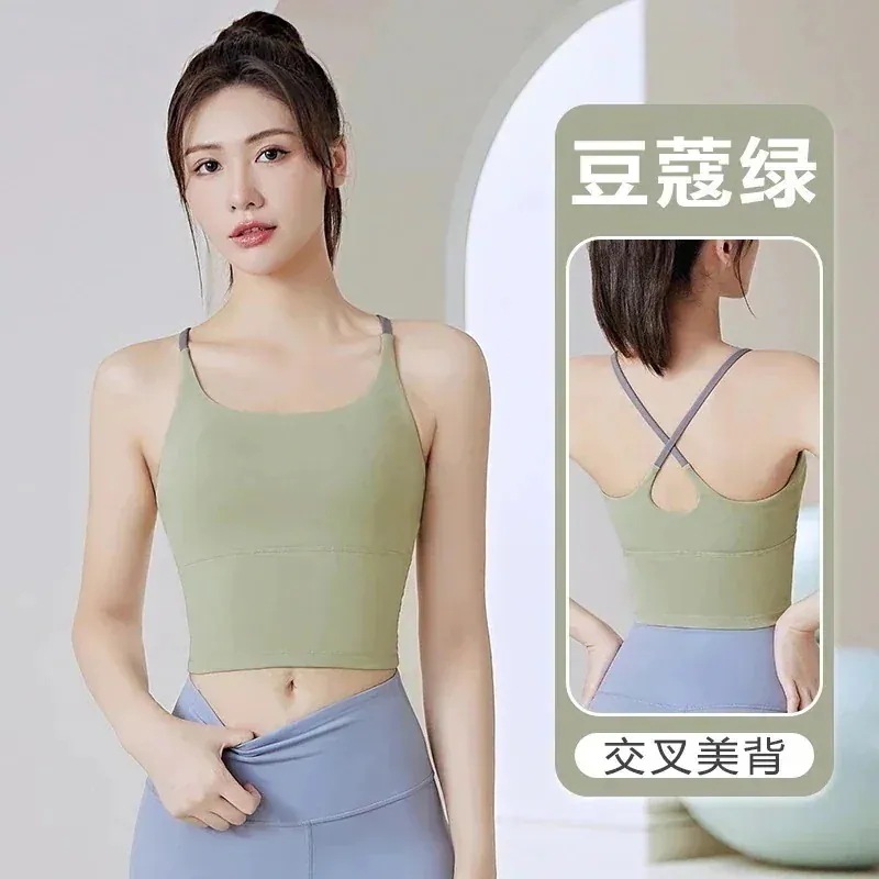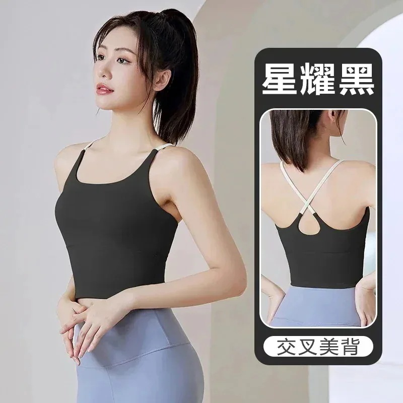 スタイル薄型ストラップ胸当てトップ女性用ヨガウェアヌードノンマーキングフィットネスヨガウェアスポーツビューティーバックトップス カップ付
