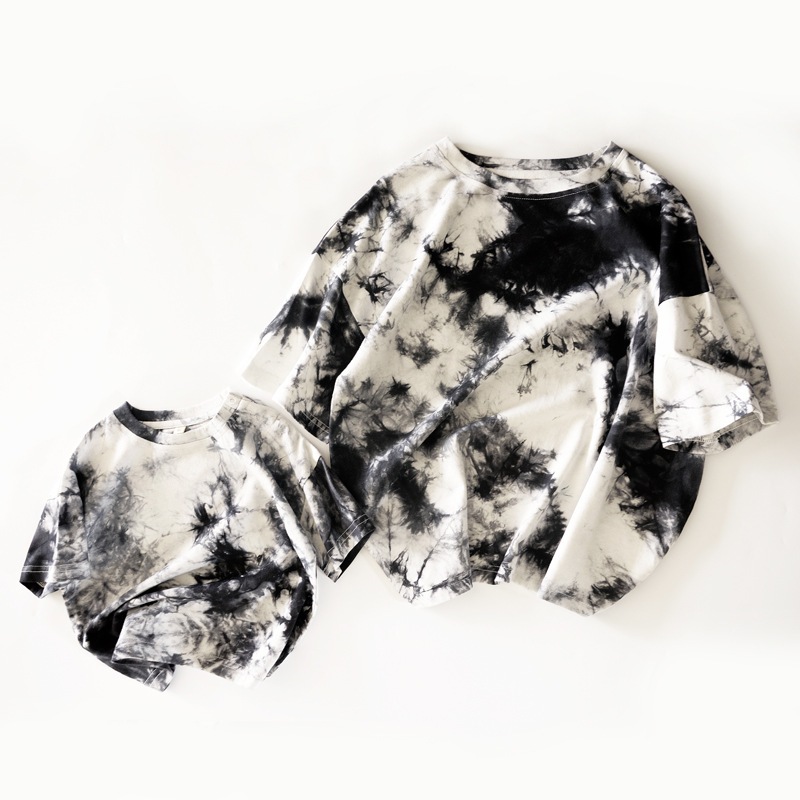 ピアノ発表会 パーティー 親子ペアウェア 子供服 夏 半袖 3人家族向け 通学 フォーマル 結婚式 黒白タイダイ ドロップショルダー 半袖水墨プリントシャツ 七五三 ゆったりサイズ 卒園式 夏服 入学