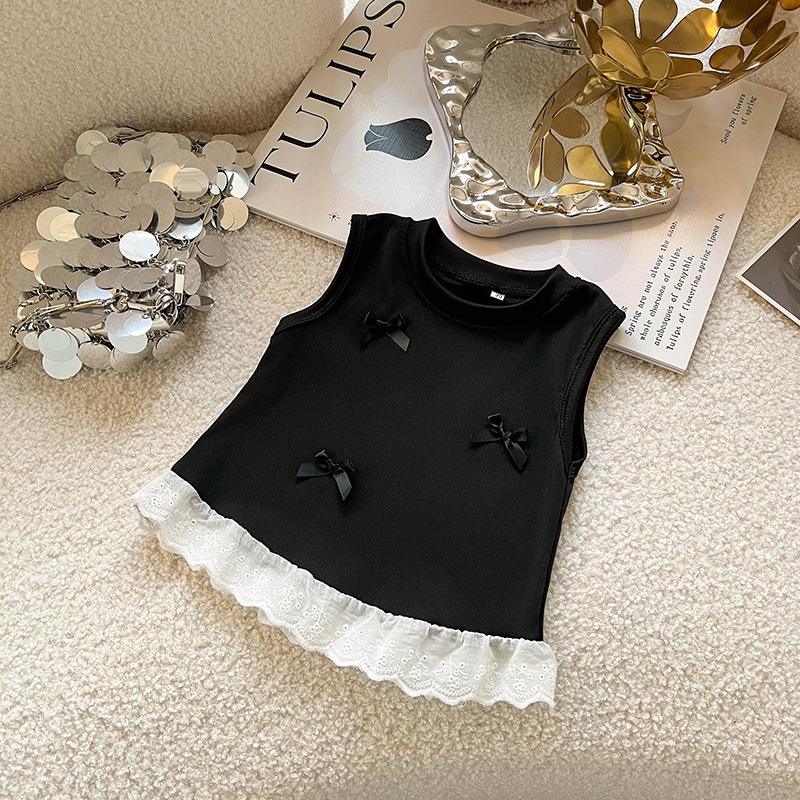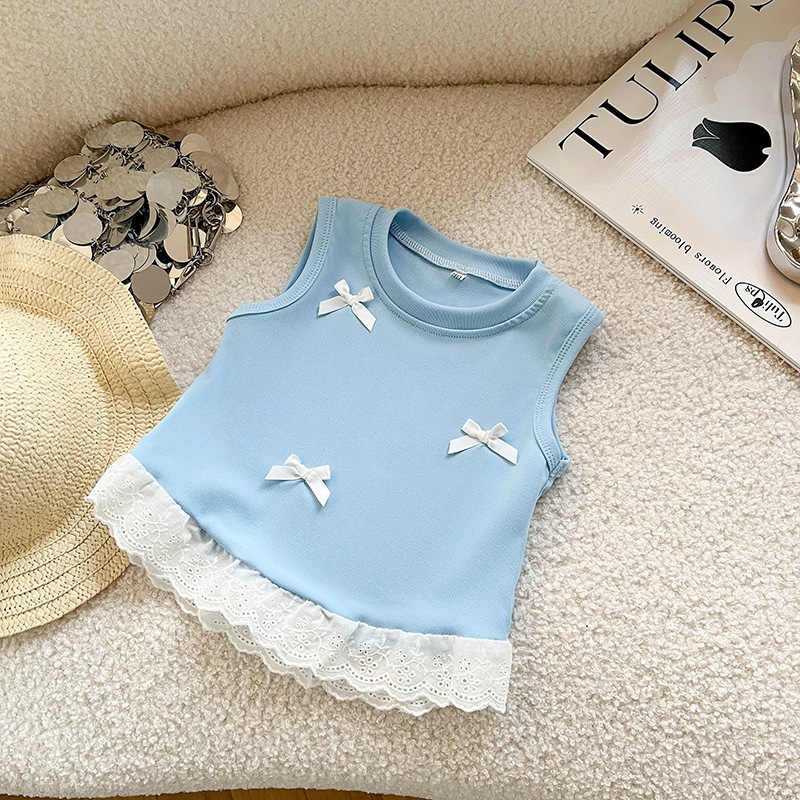 結婚式 通学 ピアノ発表会 子供服 夏 半袖 卒業式 発表会 フォーマル 入学式 七五三 パーティー 卒園式 子供服 リゾート ビーチ 新作ベビーベストおしゃれで甘いレースリボン付きノースリーブトッ