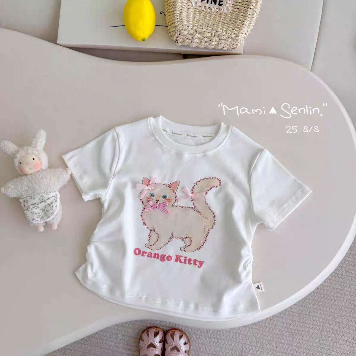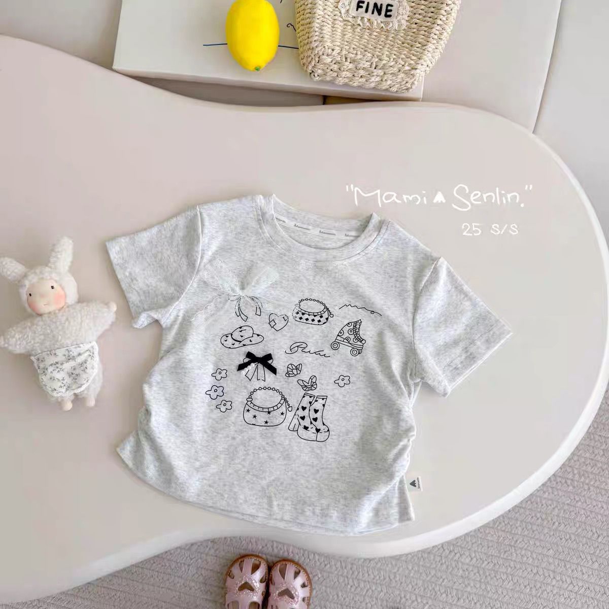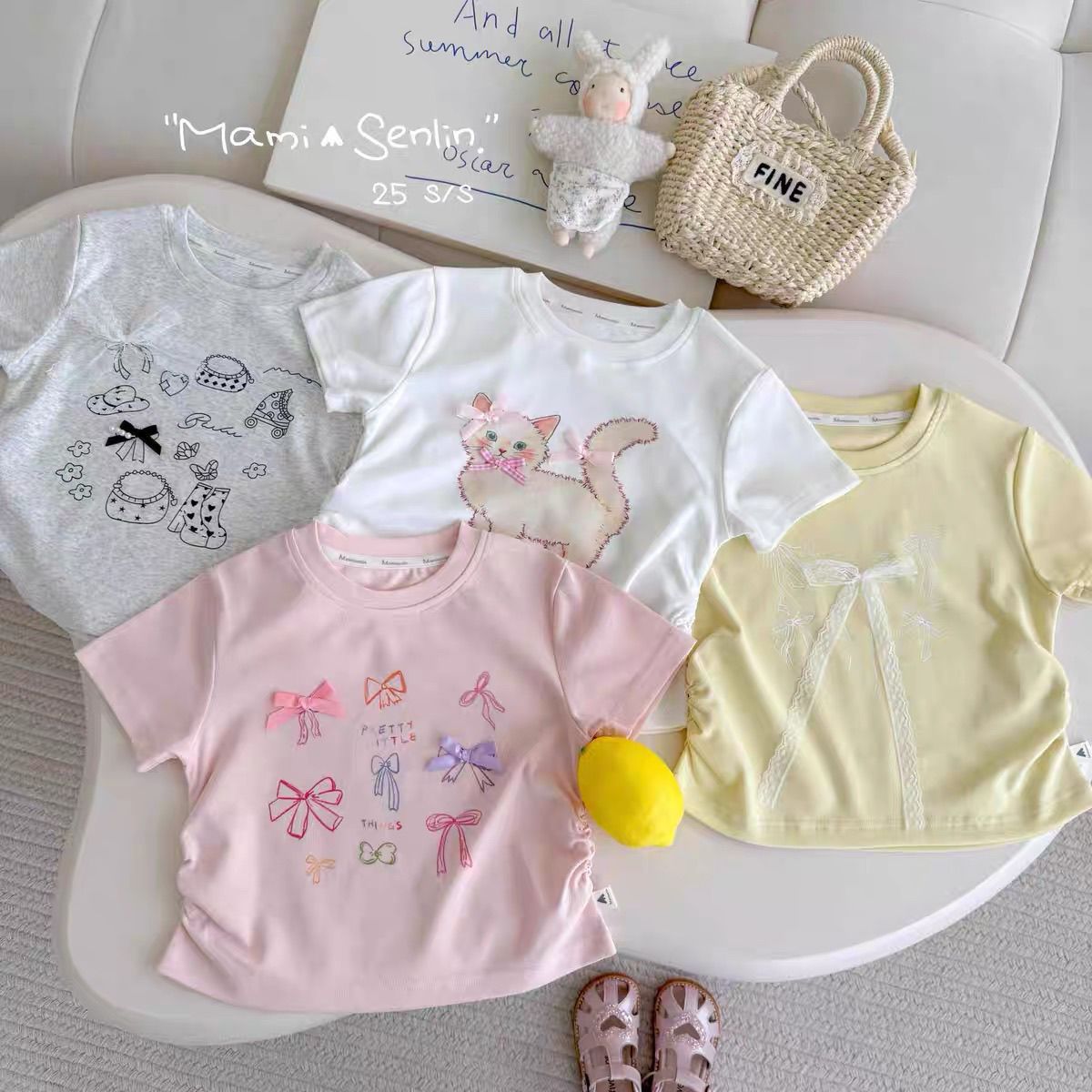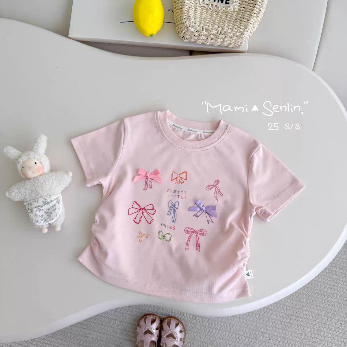 卒園式 七五三 結婚式 パーティー 入学式 通学 フォーマル 卒業式 ピアノ発表会 発表会 子供服 夏 半袖 子供服 リゾート ビーチ フレッシュで可愛いリボン柄のゆったりとしたラウンドネック半袖夏用
