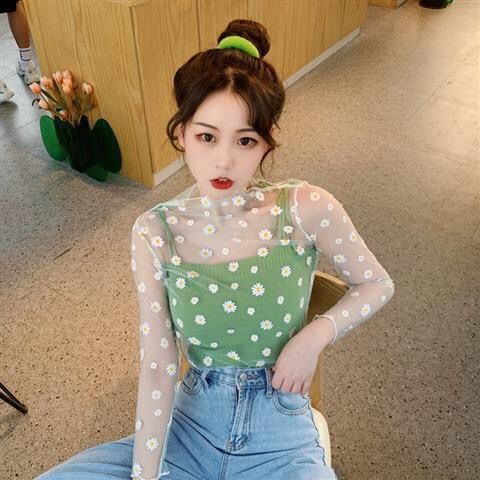 長袖tシャツ 2枚入 韓国ファッション 小菊柄 長袖 Tシャツ レディース 夏 新作 薄手 ルーズフィット UVカット おしゃれ レース トップス インナー