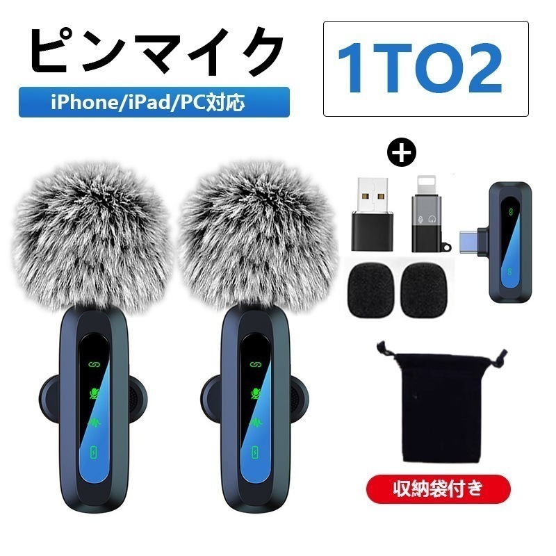 爆買 ピンマイク ピンマイク ワイヤレス iPhone/iPad/PC対応 1to2 瞬時接続 LED指示灯搭載 ノイズ軽減 音画同期 360集音