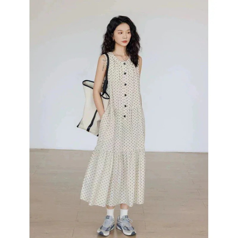 迅速出荷 2026新作 春夏 水玉 クルーネック 袖なし ゆったり ルーズ 風 ワンピース Aライン スカート リゾート スカート 韓国ファッション