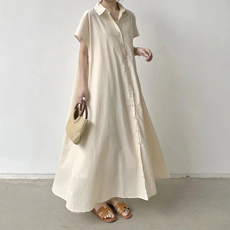 迅速出荷 2026新作 夏 ワンピース レディース プルオーバー 半袖 亜麻 無地 ゆったり ターンダウンカラー カジュアル シャツ スカート 海外向け 韓国ファッション