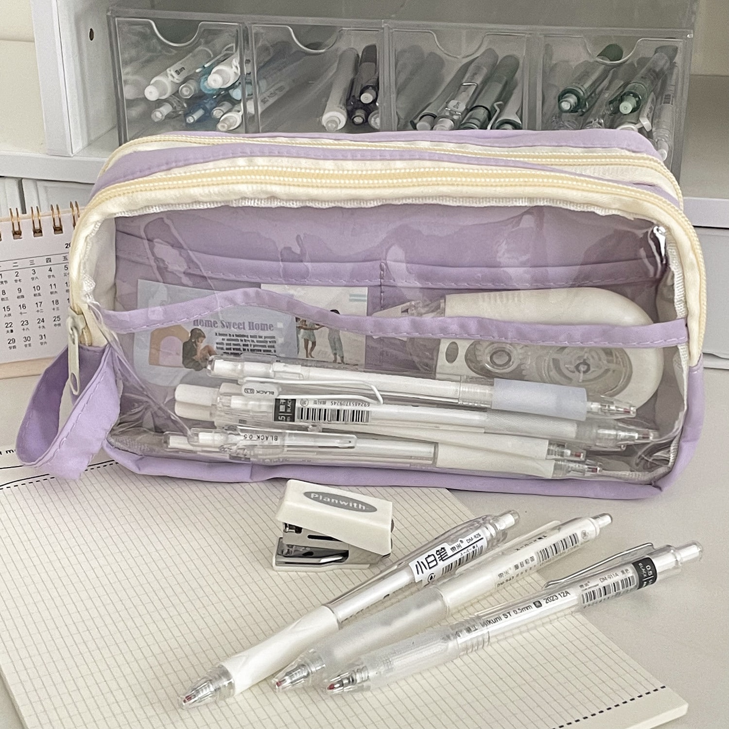 母の日プレゼント かわいい 春コスメポーチ 純透明多層ペンケース 学生用ポータブル大容量シンプル手提げ文具収納ボックス