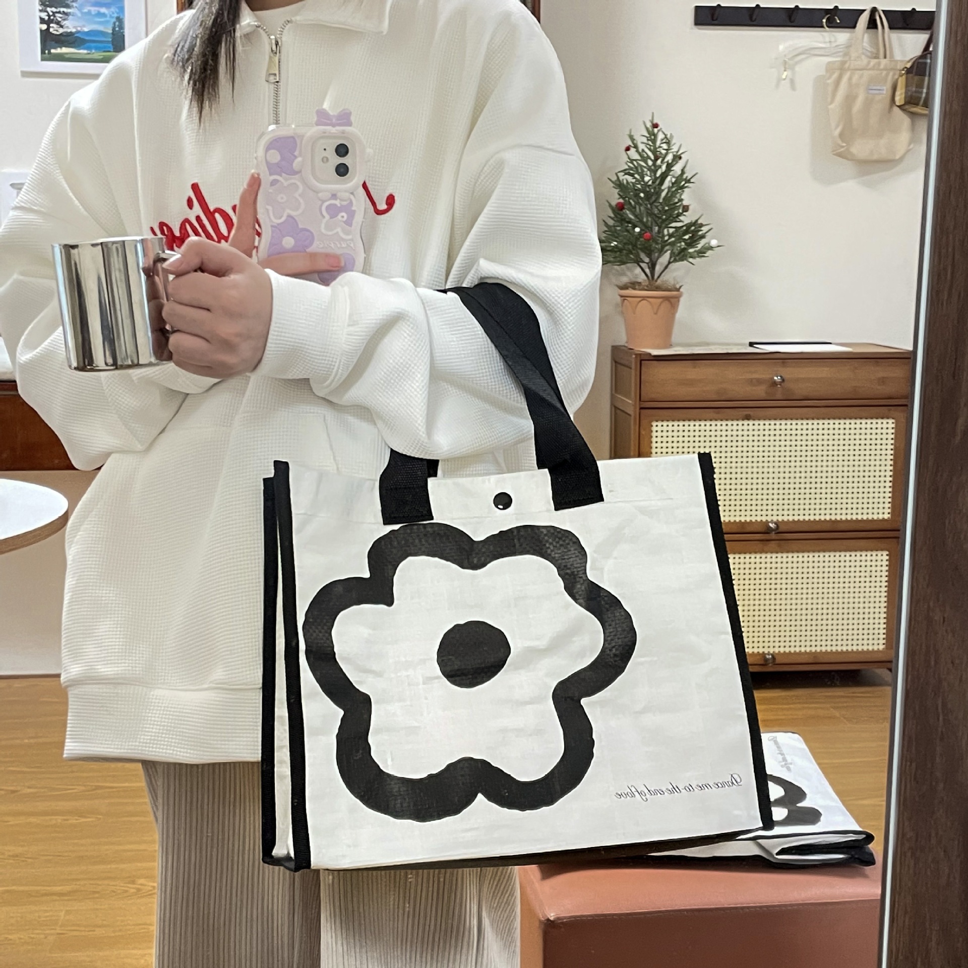 春コスメポーチ かわいい 母の日プレゼント 白黒の花柄織りバッグハンドバッグトートバッグ洗面用具入れシンプルで持ち運びやすい大容量ショルダービーチバッグ