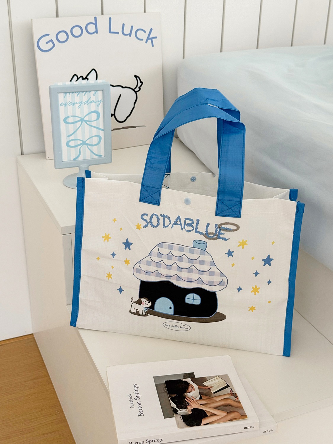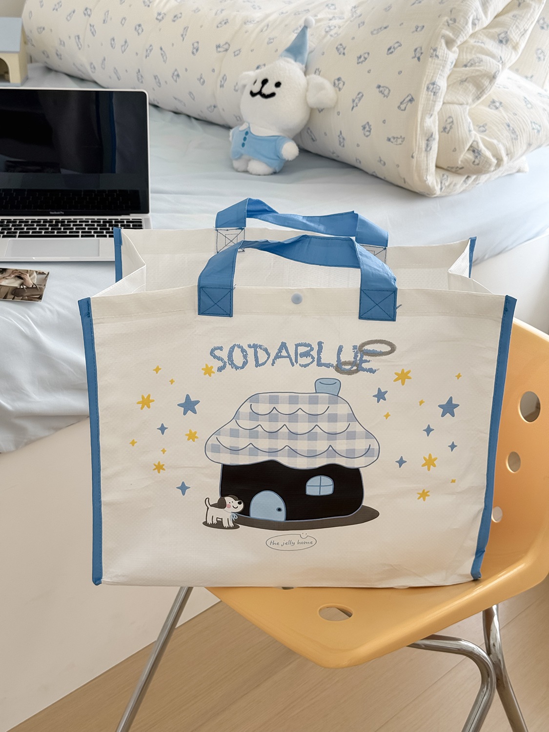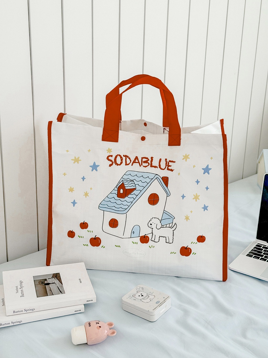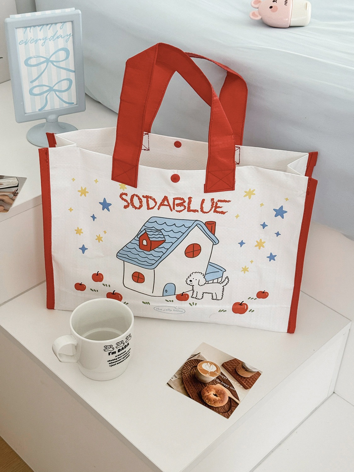 かわいい 春コスメポーチ 母の日プレゼント 家と犬の柄の編み込みショッピングバッグかわいい漫画プリント学生向けシンプルポータブルハンドバッグ