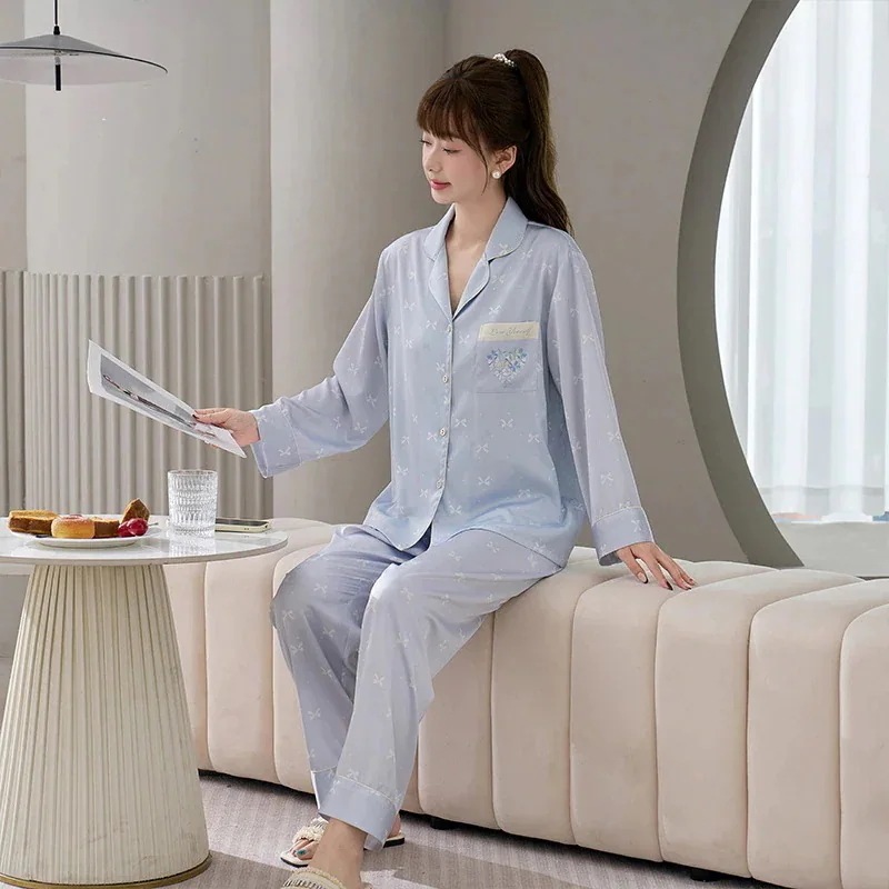 今季新作リボンプリントシルク調ブラウス ターンダウンカラー薄手 通気性良い 睡眠用ウェア パジャマ