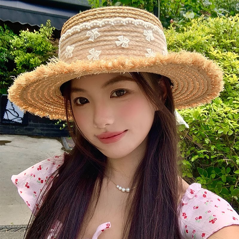 夏の新型ニット平頂麦わら帽子女性優雅日焼け止め日よけ帽子ビーチ海辺休暇レジャー太陽帽子