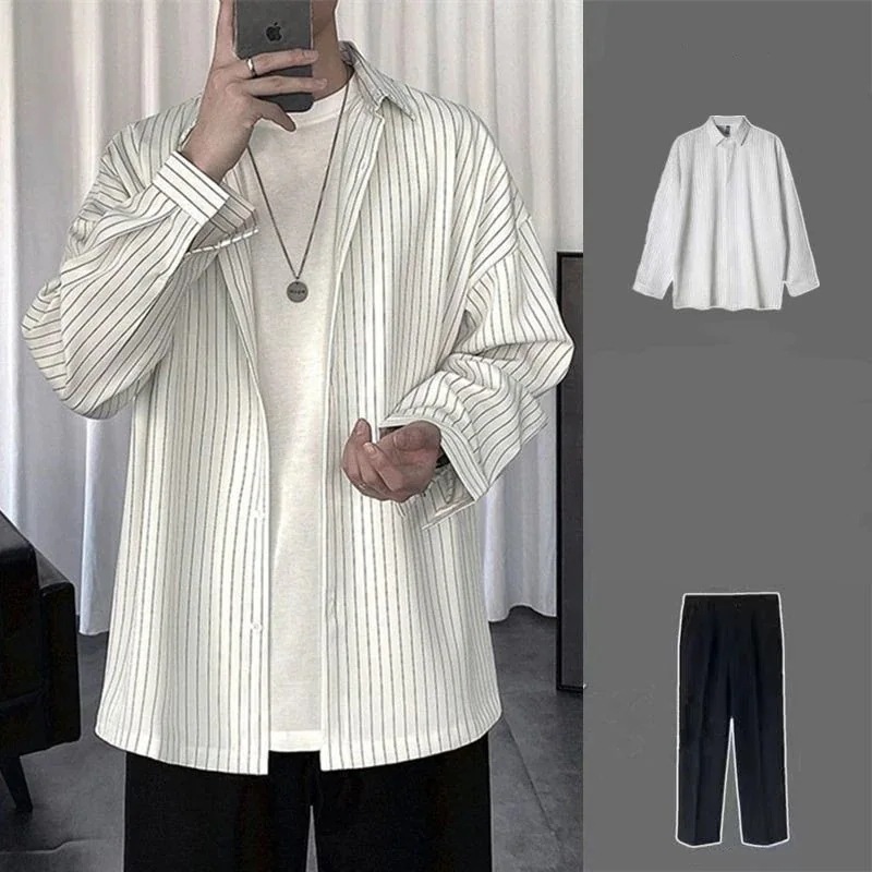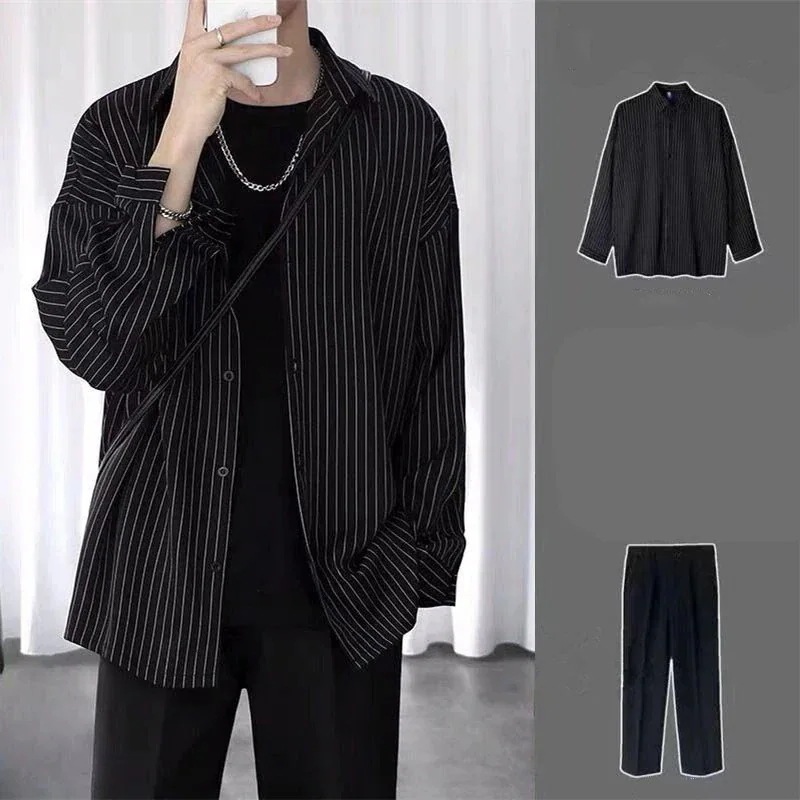 秋 メンズ 流行り 韓版 しま模様 ブラウス コーデ かっこいい ブラック スラックス 上下2点セット