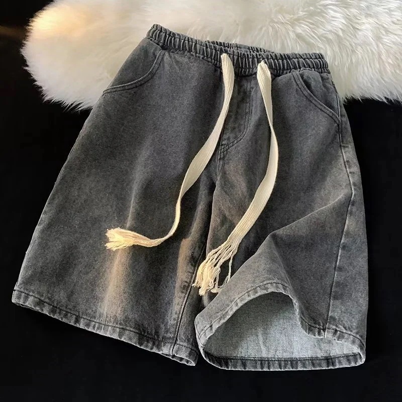 デニムショートパンツメンズ緩いワイドパンツ薄いセクションタイロープゴムウエストカジュアル五分パンツ