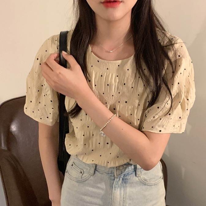 シャツ ドット柄 レディース トップス Tシャツ半袖 夏 ヴィンテージ シンプル ポイント柄 クリーン 丸ネック シワ レラックスフィット 半袖 シャツ ブラウス