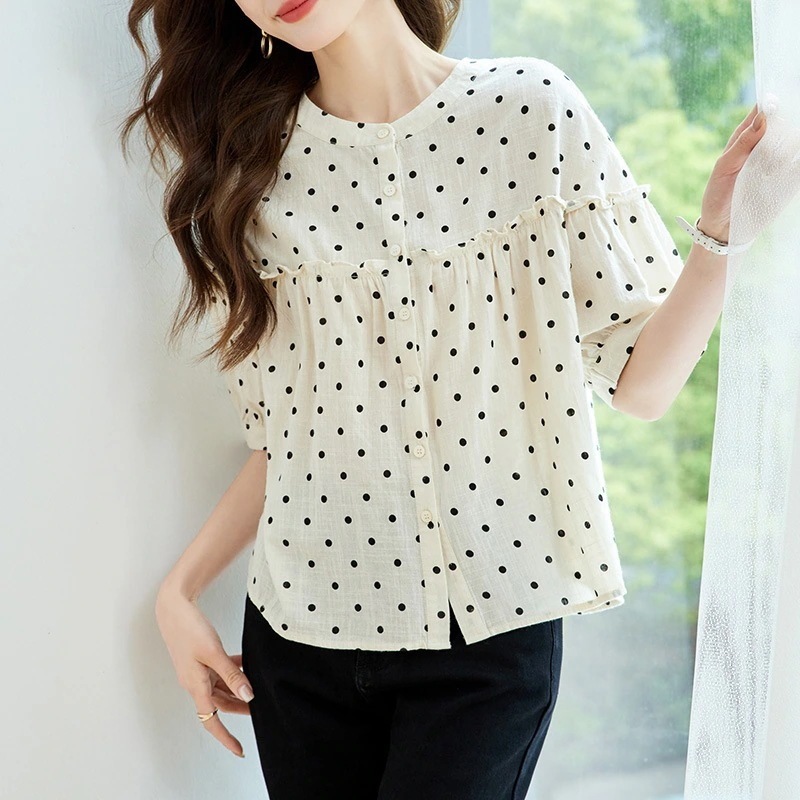シャツ ドット柄 レディース トップス Tシャツ半袖新デザイン ポイント柄 半袖 シャツ 女性用 2025 夏新デザイン パフスリーブ 丸ネック プリント ブラウス