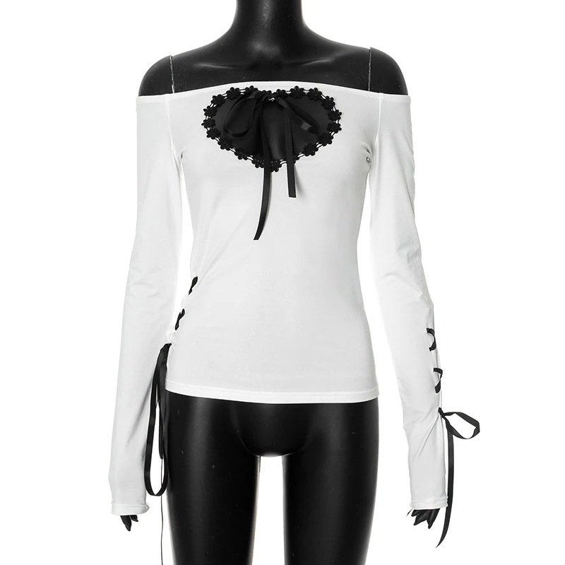 シャツ ドット柄 レディース トップス Tシャツ半袖ハート透かし レース シェイプアップ カラーコントラスト ロングスリーブ