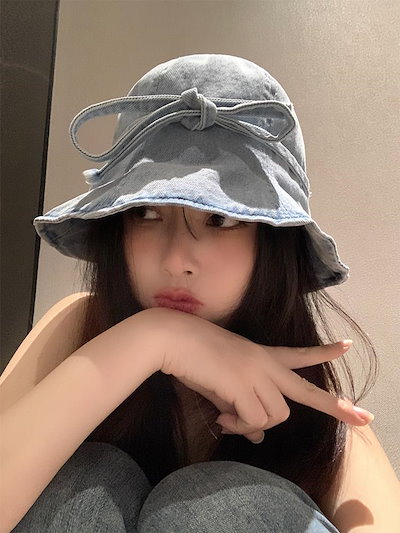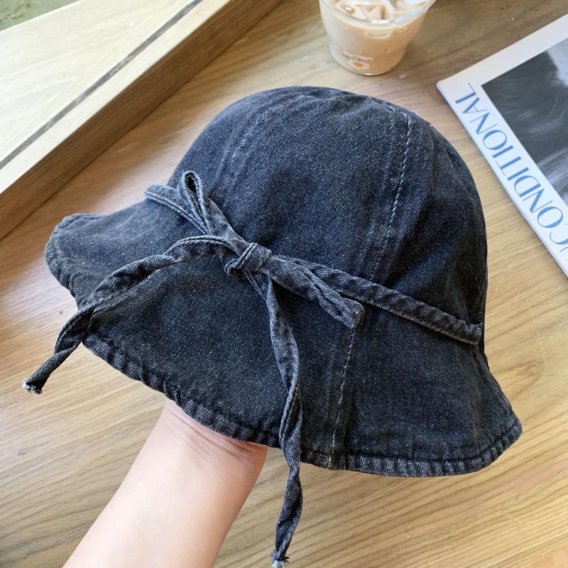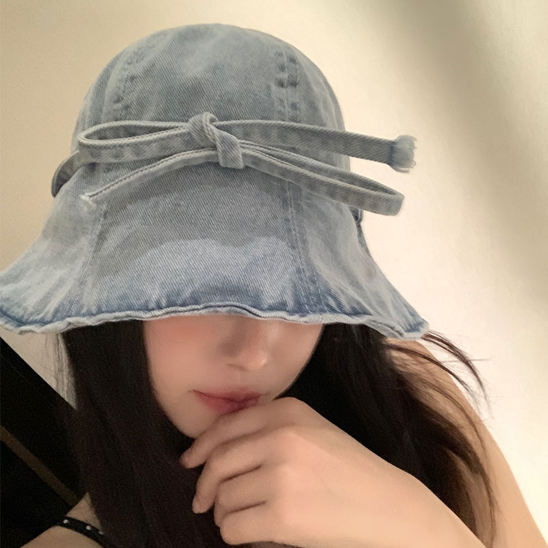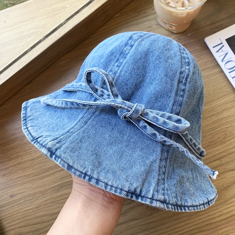 蝶結びの水洗いデニムの漁師の帽子の女性の春の夏の薄い金の大きい頭の周りの日よけの日焼け止めの帽子は顔の小さい盆の帽子を現します