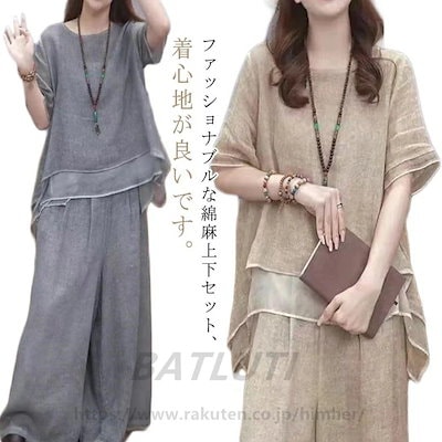 セットアップレディース夏半袖上下セットワイドパンツロングパンツ綿麻春カジュアル柔らかきれいめシンプル軽量ゆったりおしゃれ大きいサイズママコーデ透气体型カバー通勤通学デートトップ大工場製造