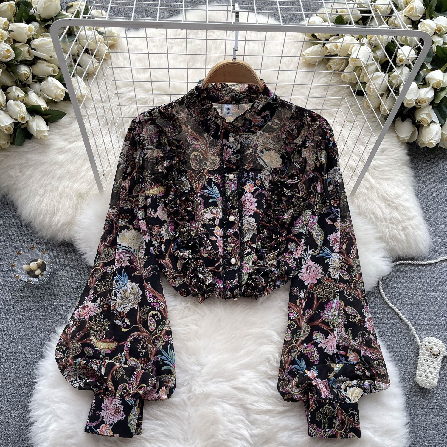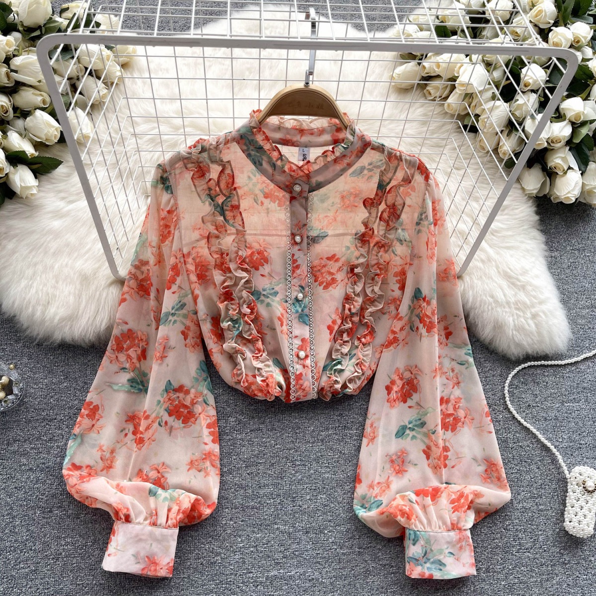 フランス風 スイート プリント シフォン シャツ シャツ 女性 春 デザイン 上品 フリル パフ袖 トップス
