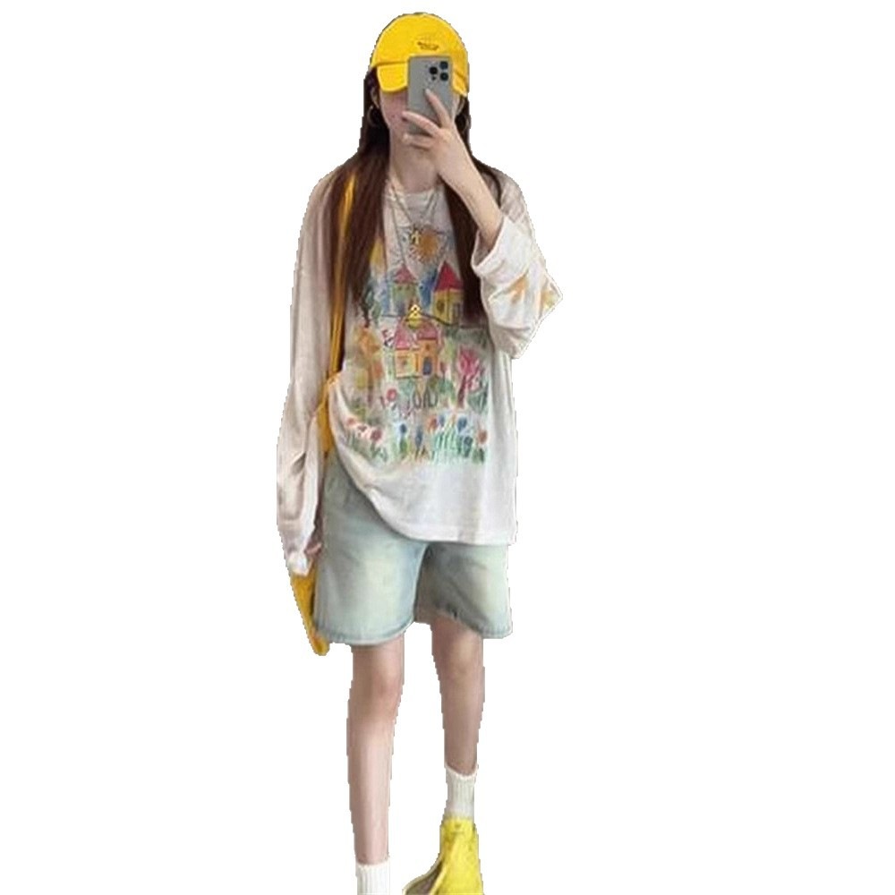 通気性 母の日ギフト 日焼け防止ブラウス 冷感 オリジナル生地の日焼け止め加工が施されたレトロなグラフィティプリント長袖シャツ女性用夏物ゆったり薄手ミドル丈ブラウストップス
