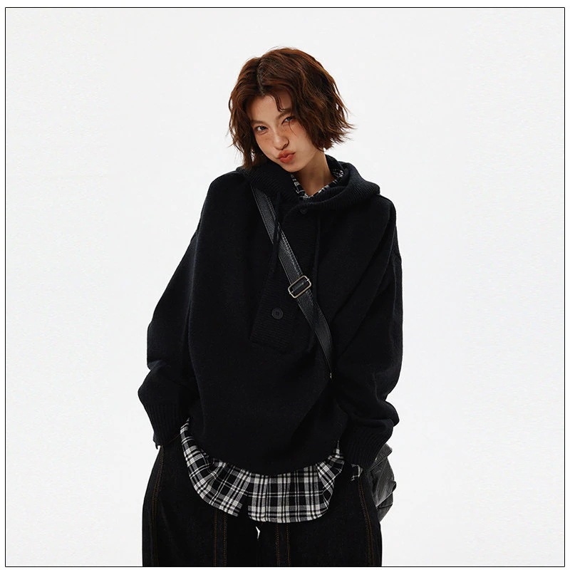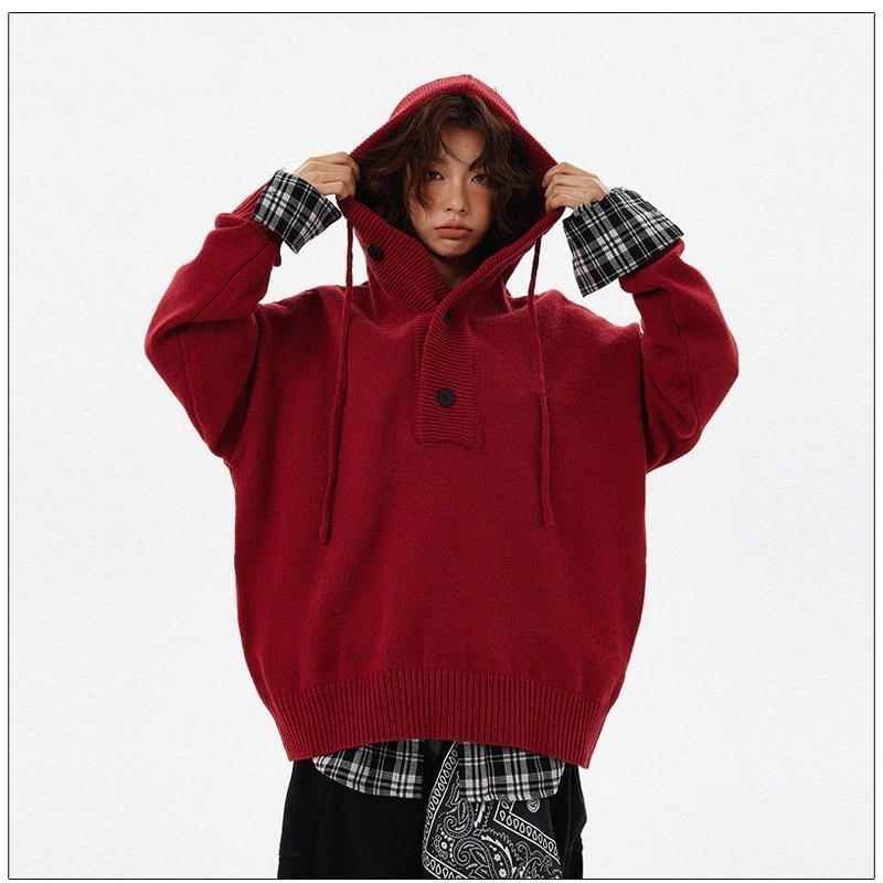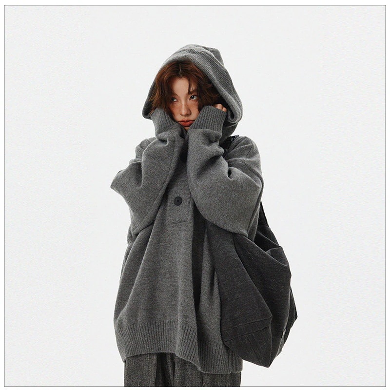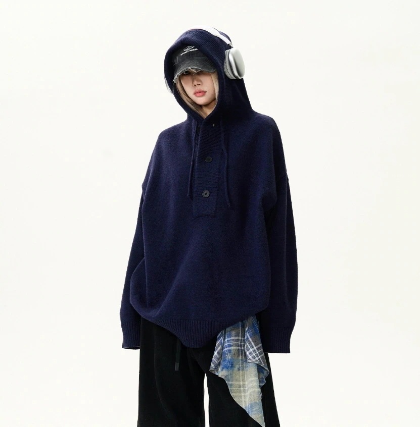彼と着たいアメリカンレトロニットパーカー レディースメンズ ユニセックス厚手ハーフボタンヘンリーネック フード付きセーターオーバーサイズストリート系ゆったり女子ビッグシルエット風26学生リンク