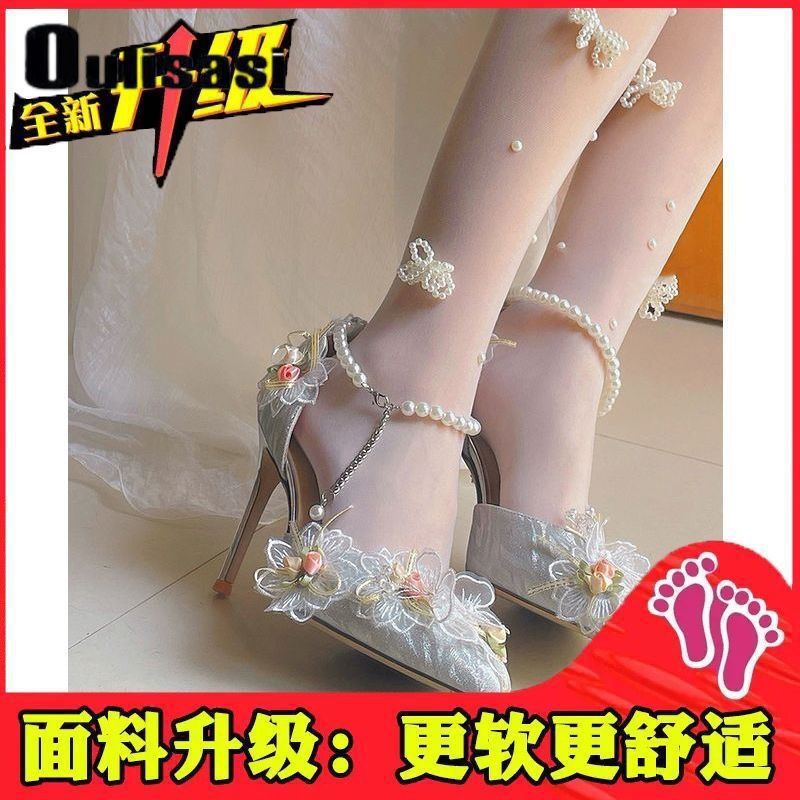 先細 花 ワンストラップ スカート 合わせ 細め ヒール レース シングルシューズ レディース ハイヒール レディース 2026 パール風 仙女