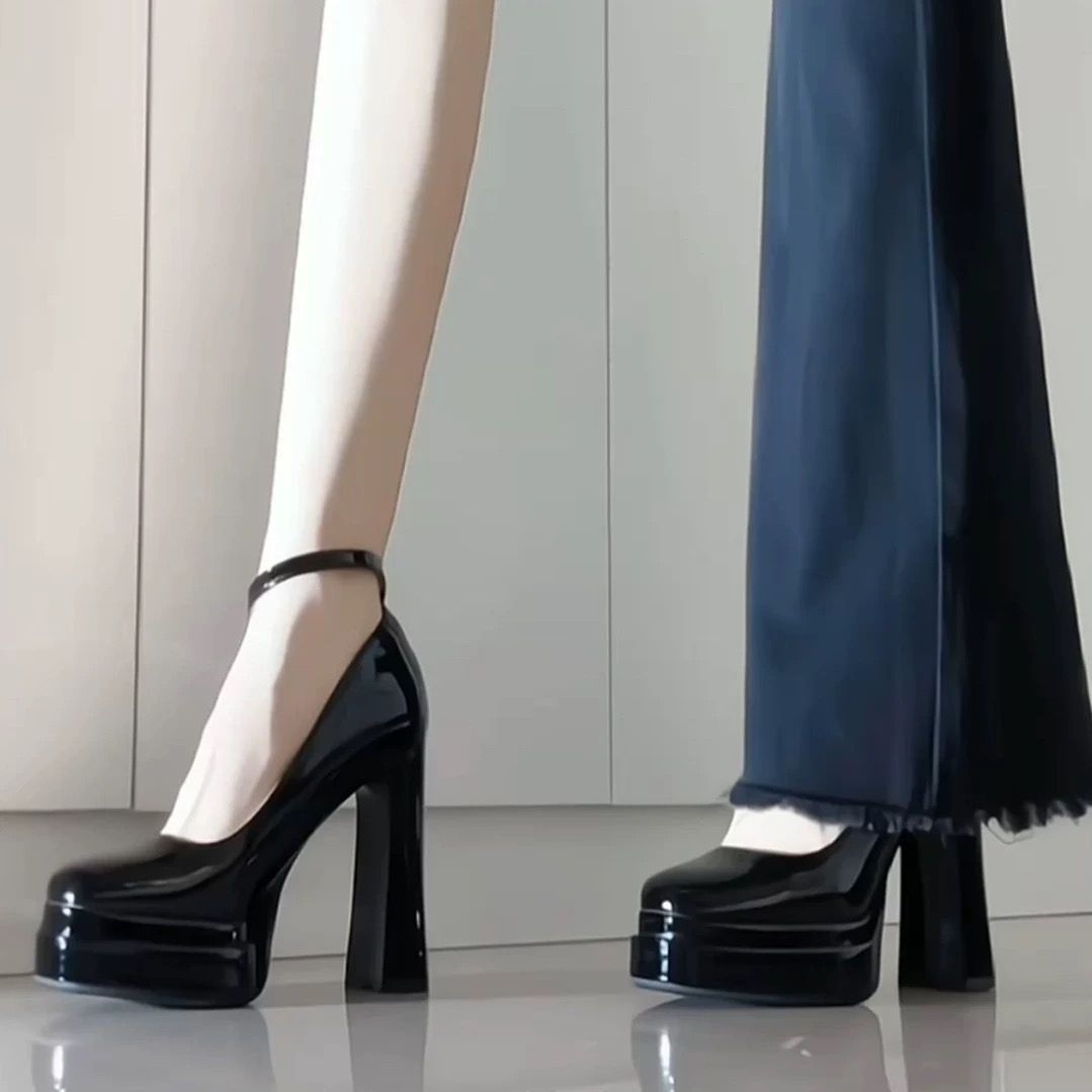 ヨーロピアン セレブ風 身長アップ 太め ヒール シングルシューズ 2026 エナメル 厚底 浅口 超高ヒール