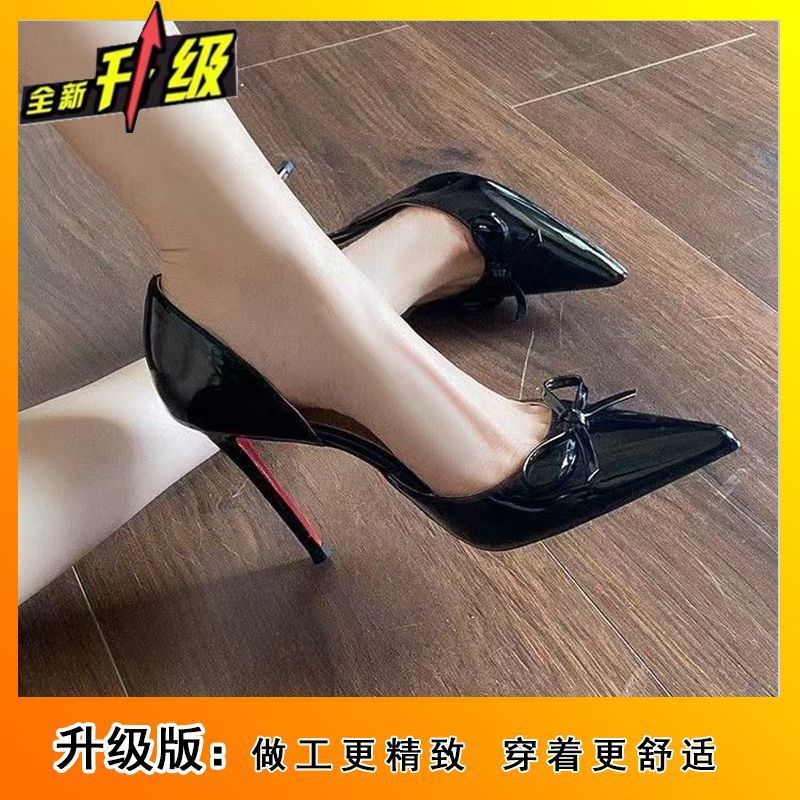 細見え 先細 エナメル サイド 空 セレブ ハイヒール サイド 空 赤底 ヌード 浅口 スタイリッシュ リボン シングル