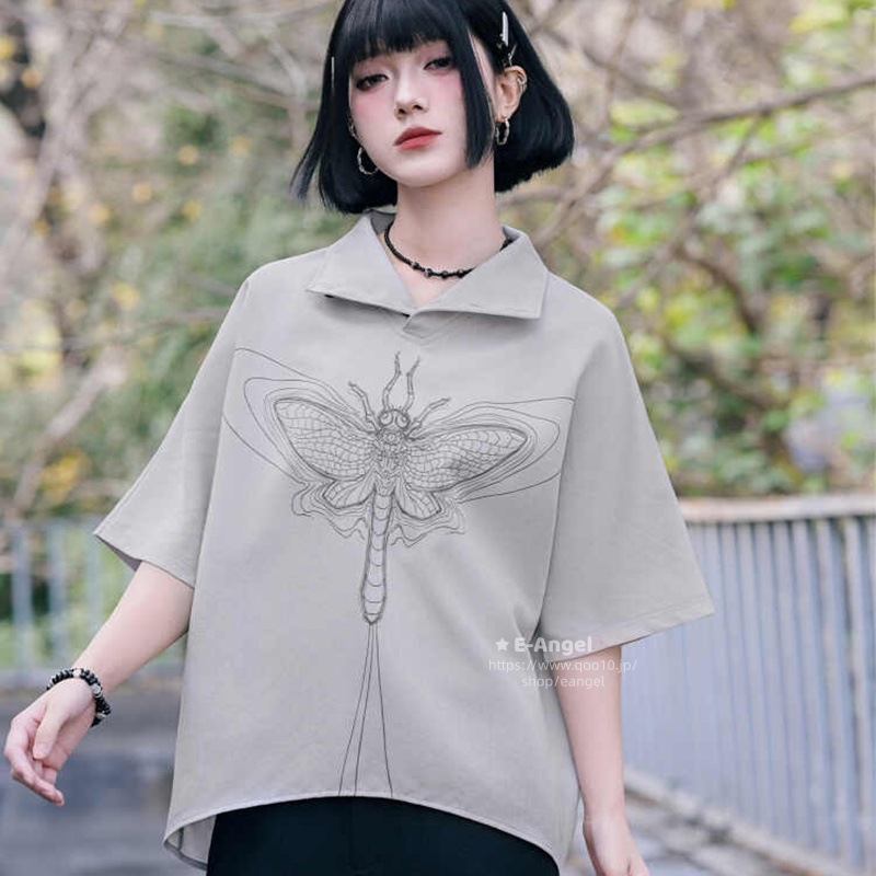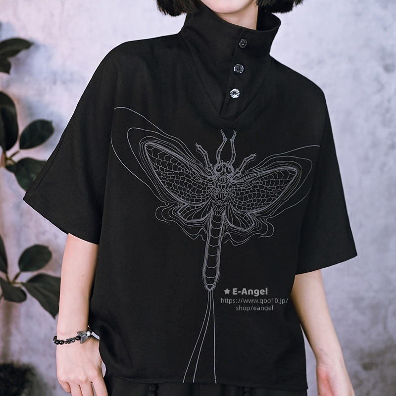 LA PELLEチャイナ風トップス 黒 グレー スタンドカラー ラペル 2way襟 中袖 レディース オリジナル浮遊プリント モダン 個性的ファッション 合わせやすい