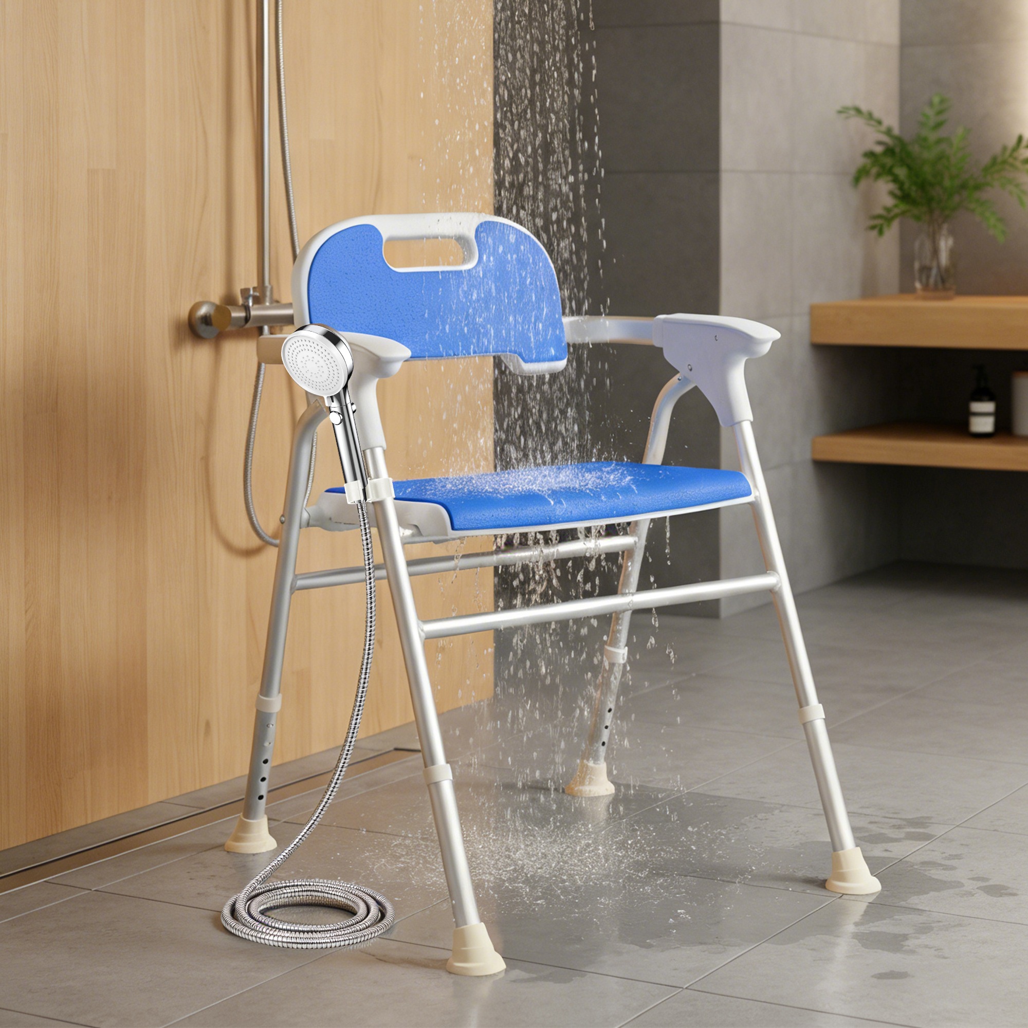 【国内発送】1680シャワーチェア 折りたたみ 5段階高さ調整 耐荷重150kg アルミ合金フレーム EVA防寒クッション シャワーフック付き 背もたれ取り外し可能 多機能 軽量 滑り止め 耐久性抜群