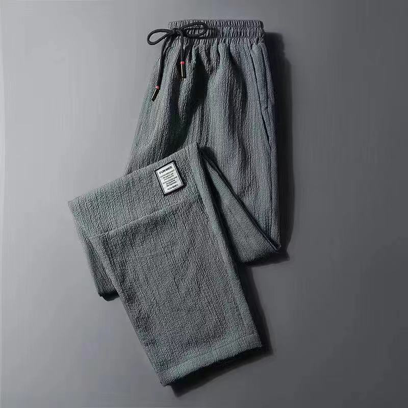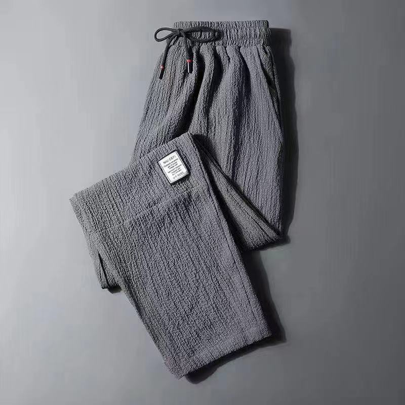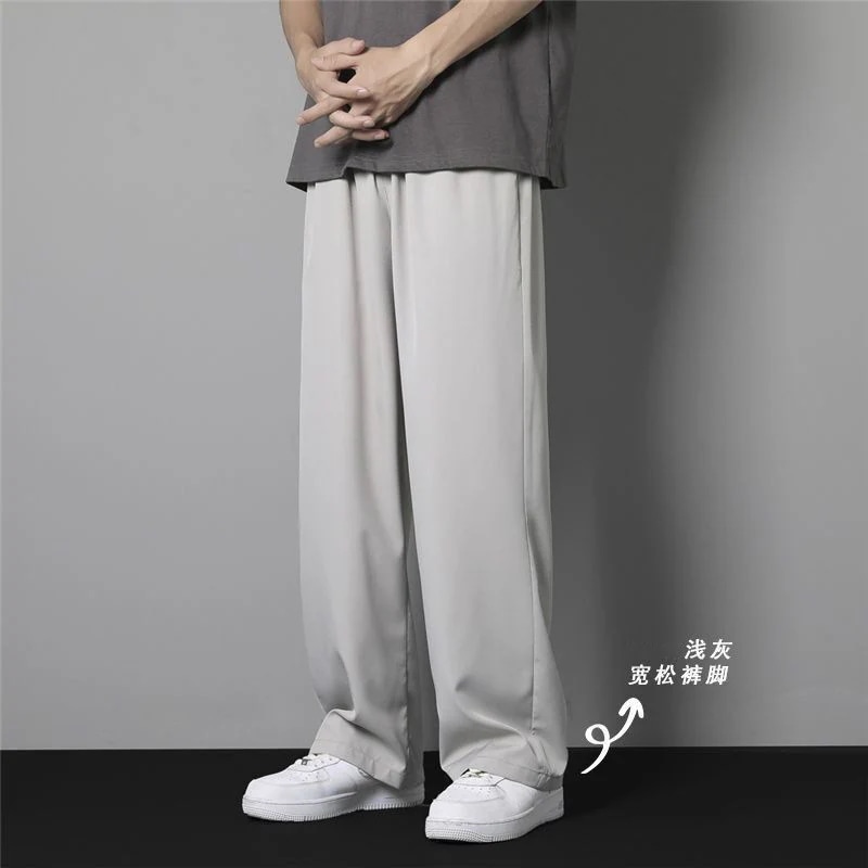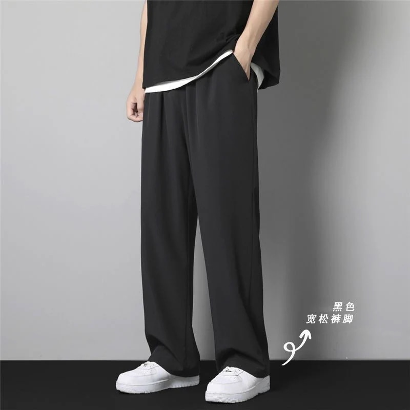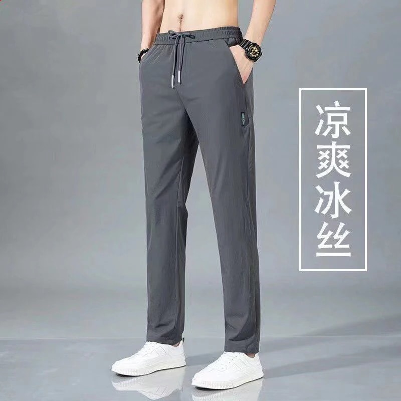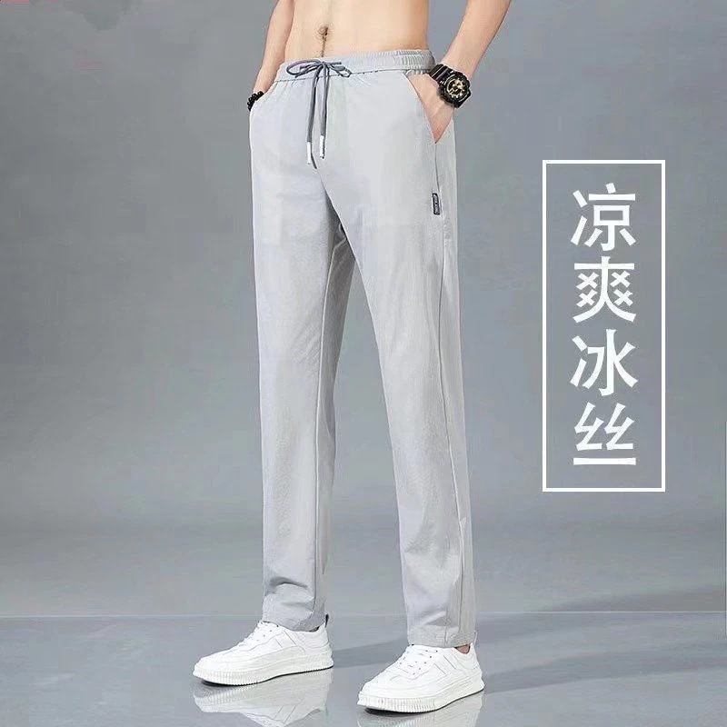 【本日限り配達料無】ゆったり冷感無地パンツメンズ夏薄手アイスシルクウエストパンツカジュアルロングパンツins潮ストレートダウン感ゆったりスポーツ九分パンツ