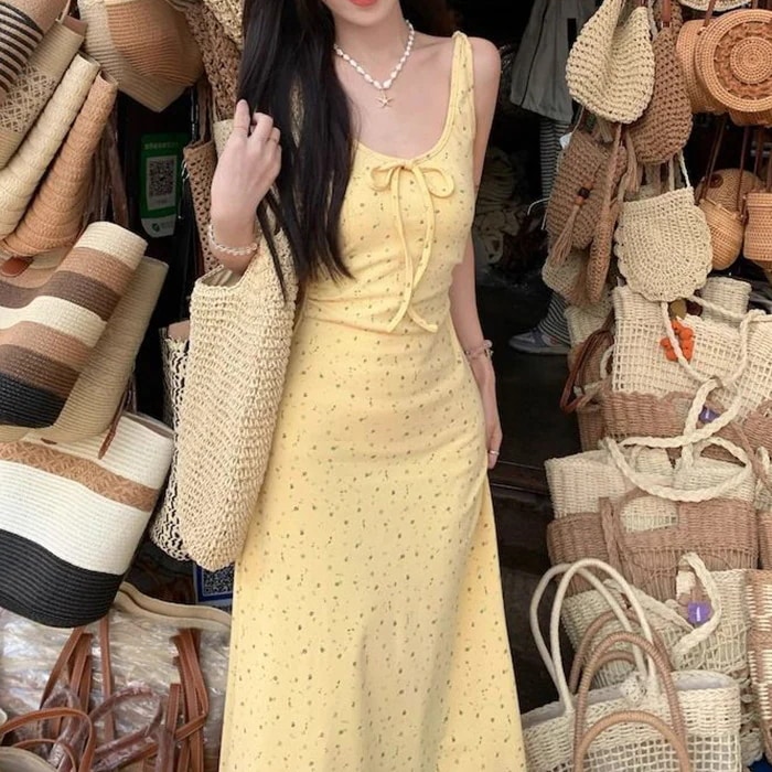 フレンチ風小花柄のストラップドレス 2026年夏の新作 ボディラインを美しく見せる スリム効果 ノースリーブのロングドレス