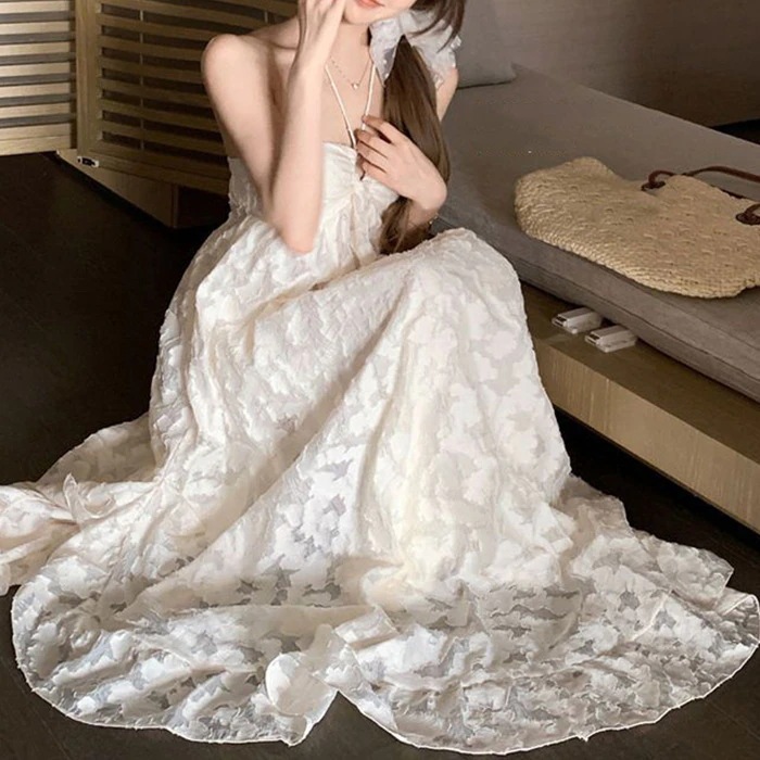 フレンチスタイルのネックラインバックレス・ストラップレスワンピース レディース 夏用 ビーチムードあふれるリゾート風ロングドレス