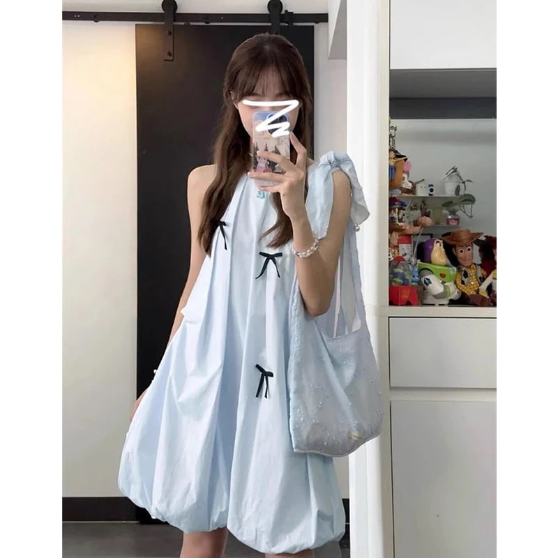 ニッチなデザイン ブルーのノースリーブワンピース 2026年新作 夏用 小柄な方でも脚長に見えるショート丈