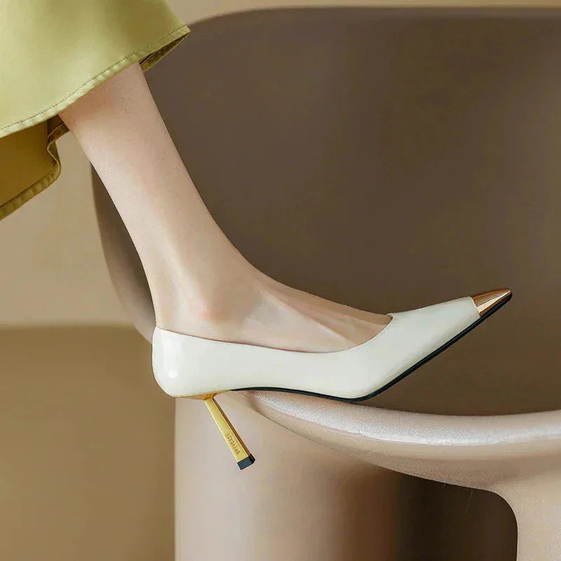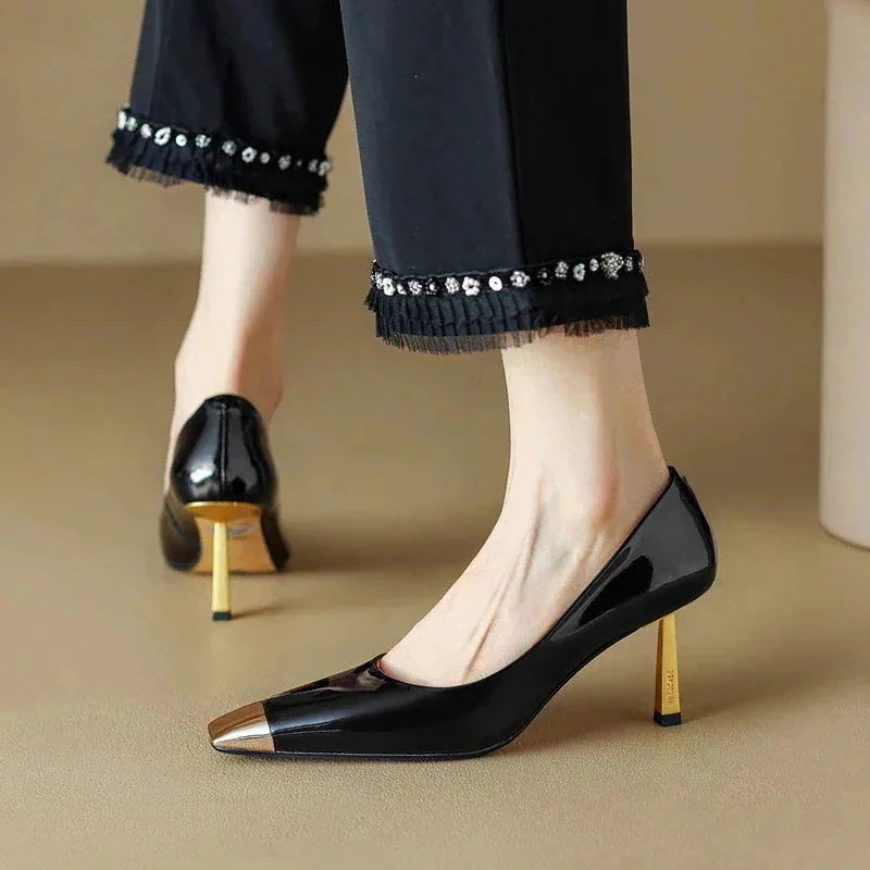 スタイルアップ!ヒールパンプス サンダル メタルヘッドハイヒール女性黒春新しい正方形の頭のパテントレザー白の気質ファインヒールシングルシューズ 韓国ファッション