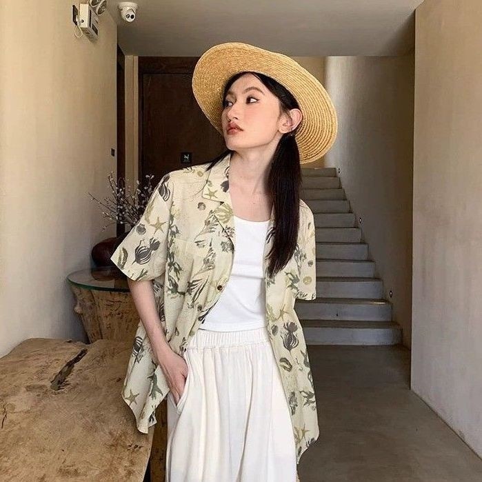 リゾート風 半袖 シャツ レディース ゆったり 小柄 薄手 春夏 日焼け止め シャツ 中長 トップス