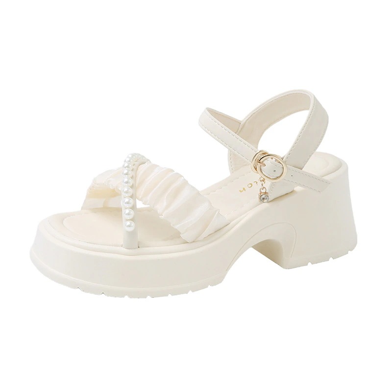 2025年新作 レディースハイヒールサンダル 夏用 パール装飾 どんなスカートにも合わせやすい 厚底ローマサンダル レディース 厚底