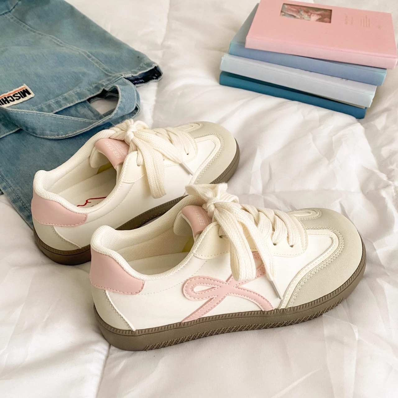レトロでニッチな厚底ツートンカラーのスニーカー(レディース)2025年新作 春夏用 リボン付き カジュアルで合わせやすいホワイトスニーカー 厚底カジュアルシューズ