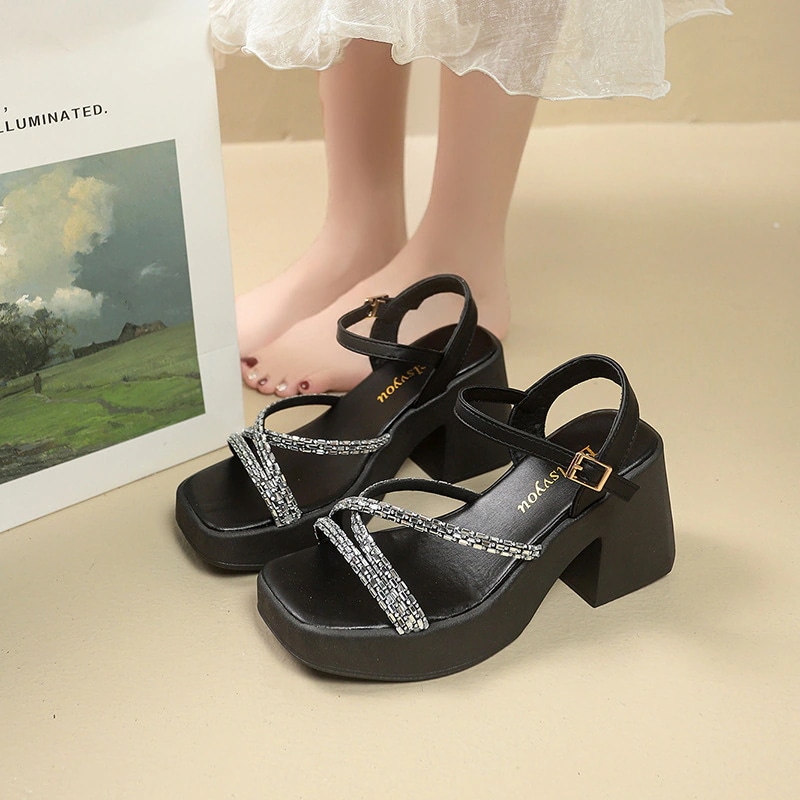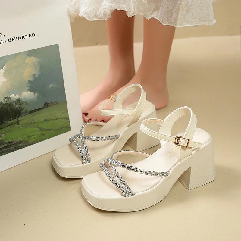 2025年新作 レディース厚底サンダル 夏用 外履き ラインストーン付き ヒールアップ 太ヒール ソフトソール 小柄な方におすすめの厚底ヒールサンダル