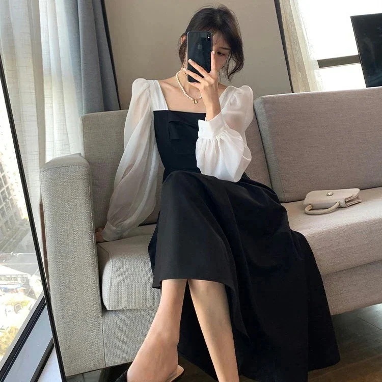 【即納】Q10最安値!ワンピース女性薄型長袖黒ロングスカート 韓国ファッション 新作 春 ワンピース