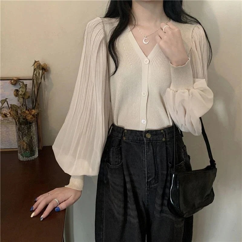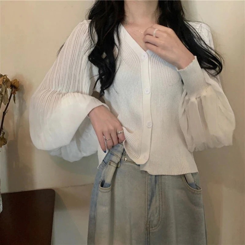 【即納】【3枚ご購入で200 OFF!】プルオーバー ニットトップス レイヤード ボリューム袖 シアー袖 切り替え レディース ドッキングトップス 紫外線対策日焼け防止服 ボタン付き ニット かわいい