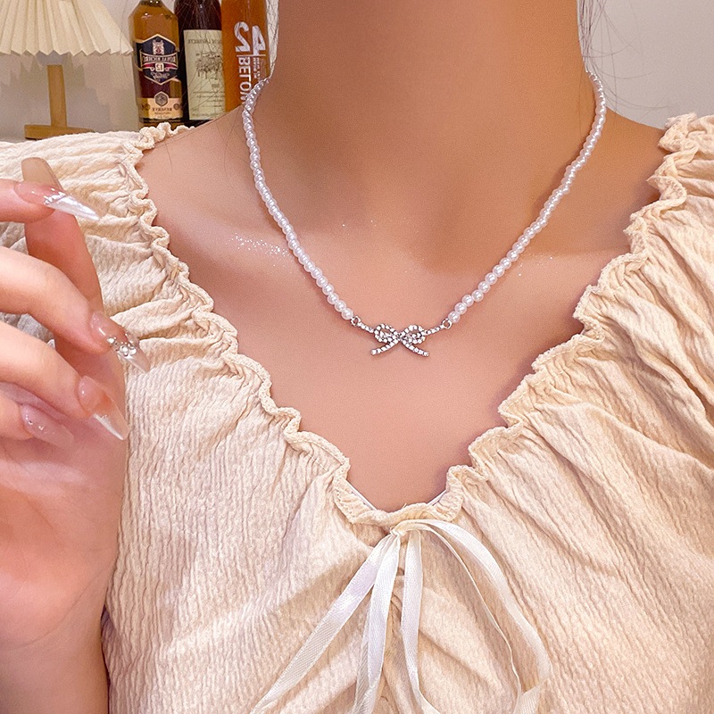 風 高級感 シンプル 小粒パール チョーカー スタイリッシュ ダイヤモンド留め リボン ネックレス 女性
