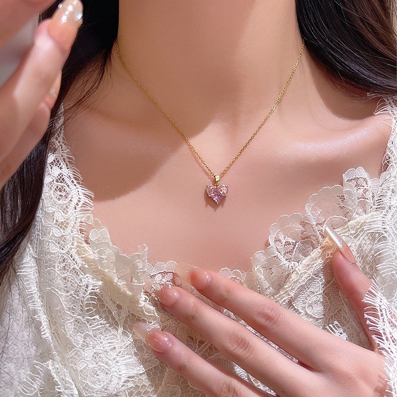 超キラ ピンク ジルコニア ハート ネックレス 女性 スタイリッシュ チタンスチール チョーカー ネックレス
