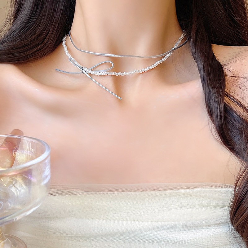 韓国風 二重 重ね付け リボン チョーカー 甘め風 スタイリッシュ パール ネックレス 女性 ネックレス
