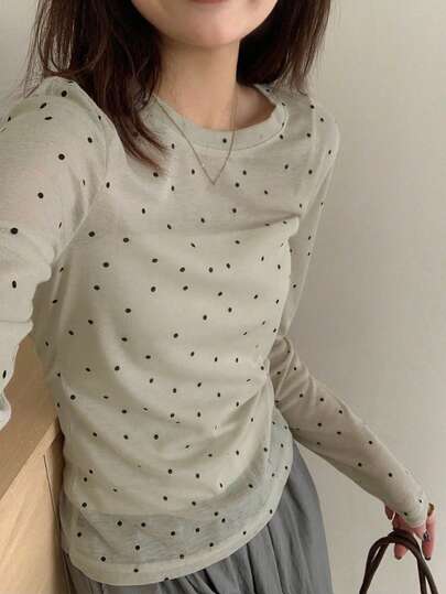 ポルカドット夏新作 ポルカドット スリムフィット クルーネック 韓国風 軽量 長袖シャツカジュアル UVカット スプリング