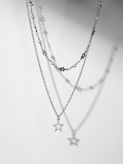 1個 シルバー 金属 手作り チェーン 付き 星&月 ペンダント 多層 ネックレス