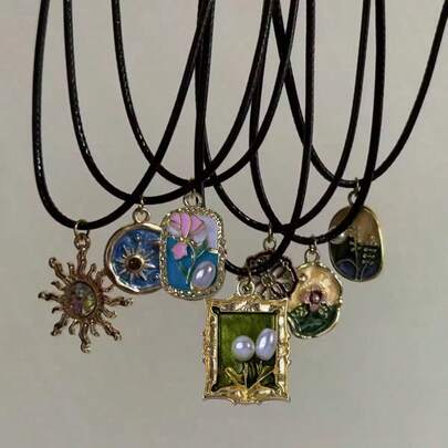 レザーコード付き レディース ヴィンテージ オイルドロップ フラワーサン ペンダントネックレス